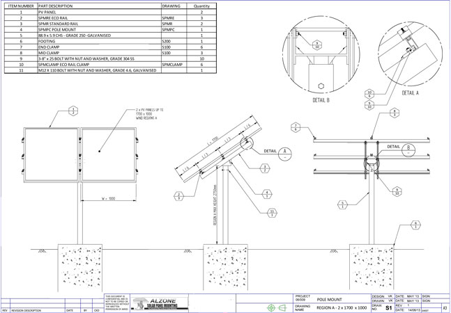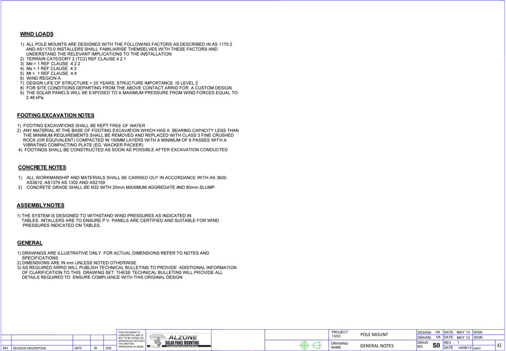 Alzone Pole Mount Kits (P/No SPMPMKIT1600x850 & P/No SPMPMKIT1700x1000) are Wind Load Certified by an Engineer for use in Australian Wind region A, providing the concrete footing, module installed height and panel dimensions comply. Compliance is available only when system uses the 80NB pole.