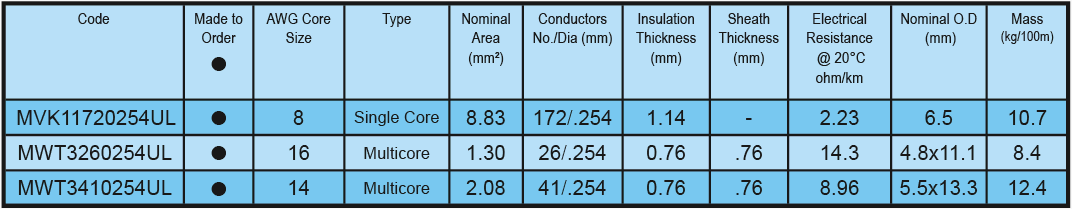 Multicore: Round - Core sizes 18AWG(0.85mm2) to 6AWG (13.2mm2)